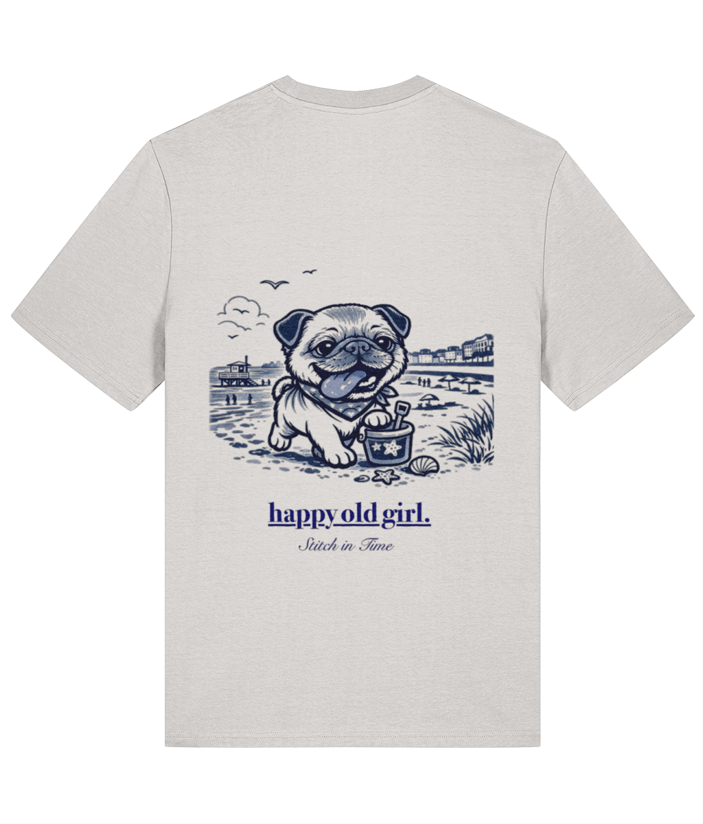 A relaxed unisex t-shirt with our 'happy old girl' print on the back and the classic minimalist Stitch in Time logo embroidered on the front. Created as a small tribute to the loveliest old girl you'd ever meet. This piece is playful, simple, and made to be worn often.