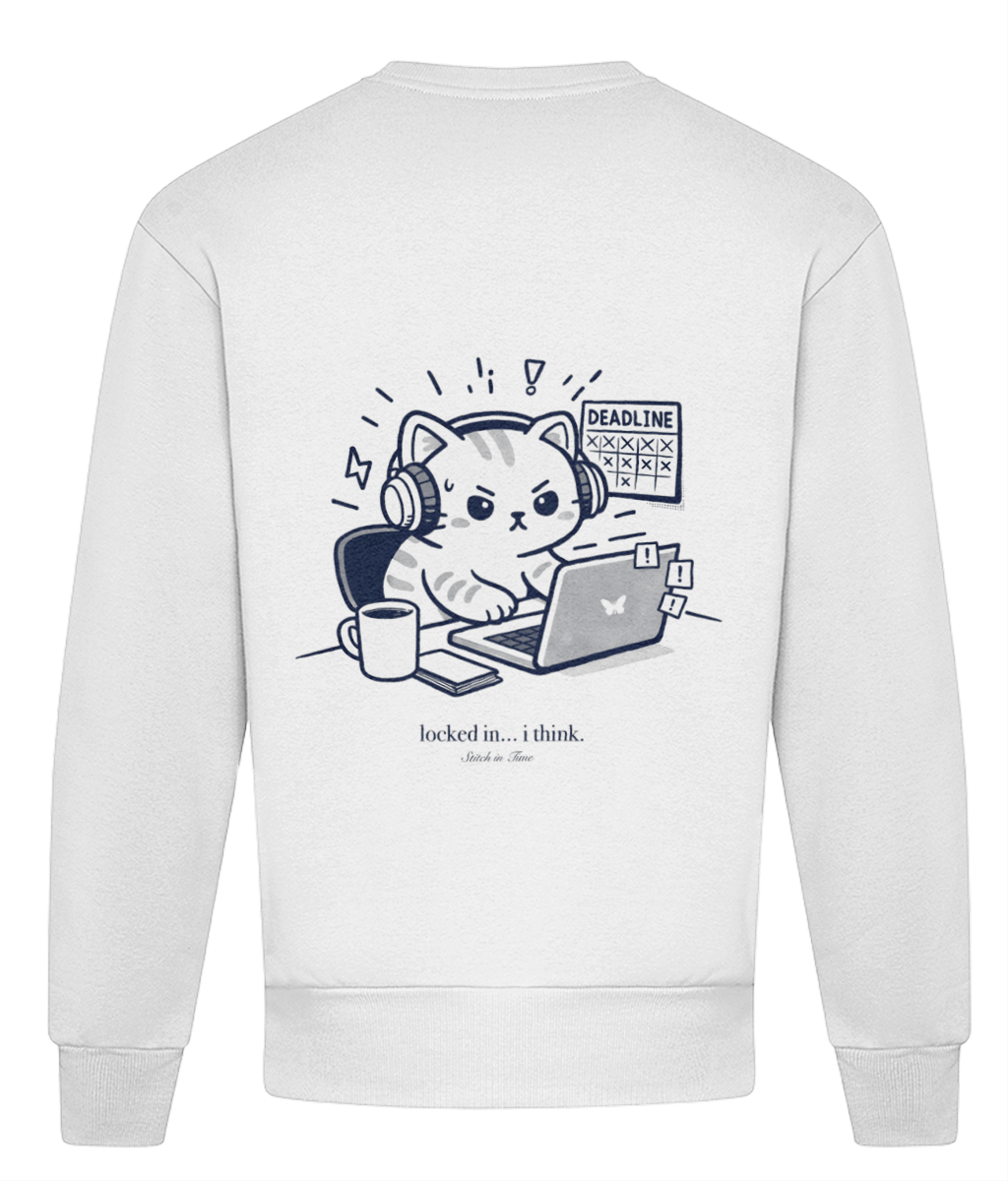 A relaxed-fit sweatshirt featuring our “locked in… i think” back print and minimalist Stitch in Time chest logo. Designed for anyone trying to get their life together without taking themselves too seriously. Finished in our signature cream and navy palette. Made from a heavyweight, premium, cotton-rich fabric, it has an oversized boxy fit that stays true to size, with a crew neck plus ribbed cuffs, collar and hem.