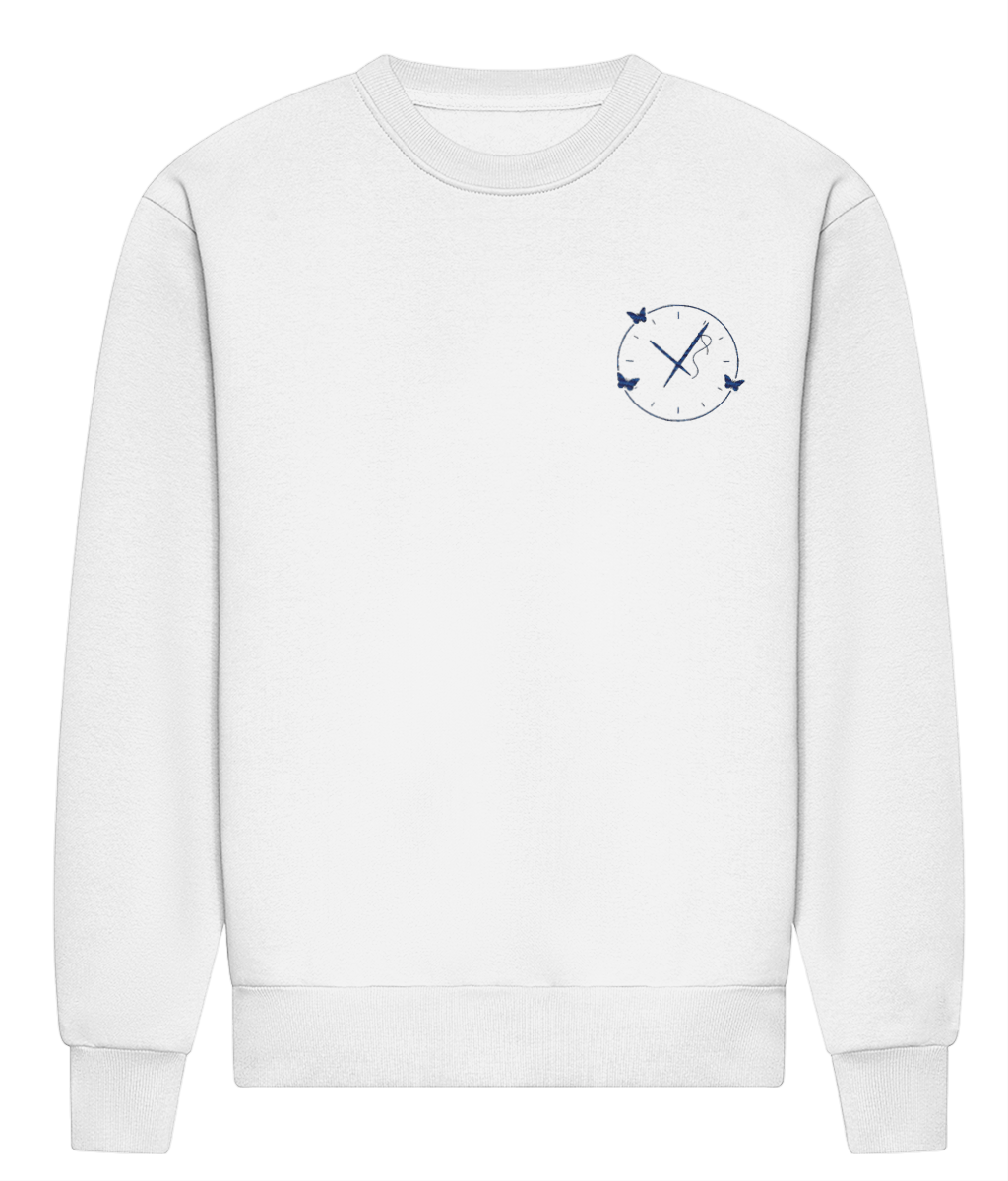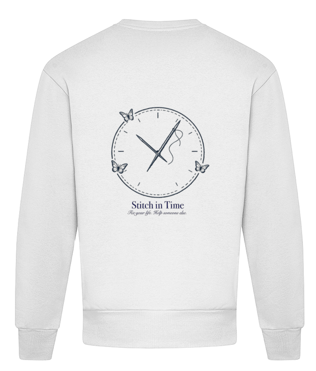 A core Stitch in Time staple. This relaxed-fit sweatshirt features our minimalist chest logo and signature back print. Clean, understated, and designed for everyday wear in our signature cream and navy palette.